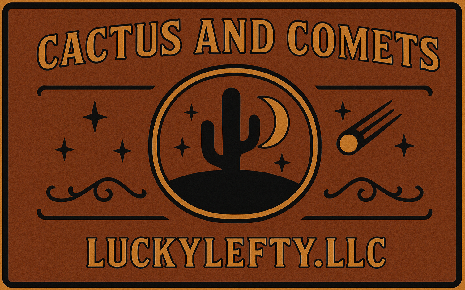 A desert print stitched with contradictions - “CACTUS AND COMETS” plants barren mesas, scattered cacti, and wide horizons under skies lit with streaking fire. It’s part western classic, part cosmic intrusion, a shirt that feels timeless and otherworldly all at once.