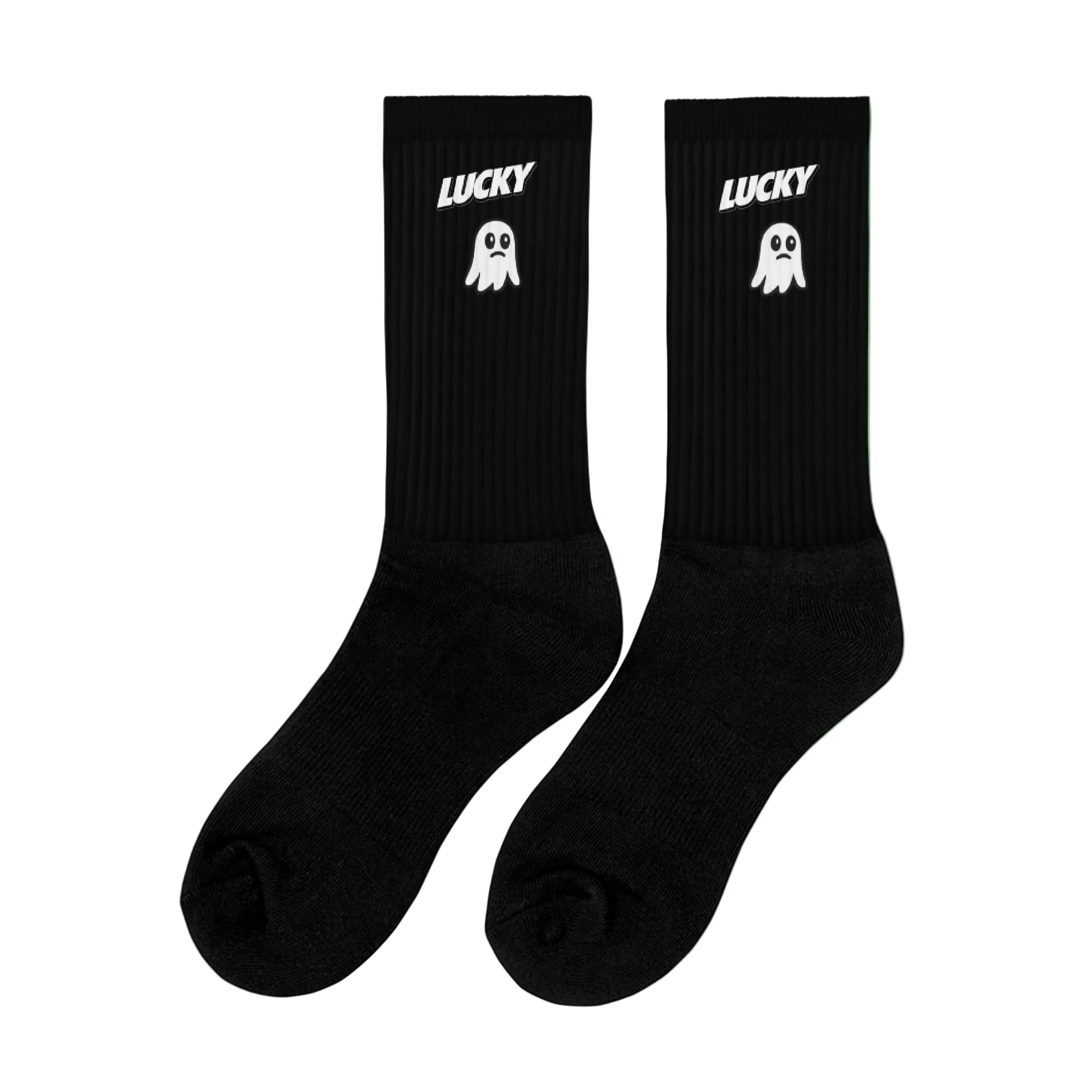 These socks are the feet's first choice thanks to their cushioned bottom. All LUCKY SOCKS are black because white socks are crazy. Guaranteed bold colors that won't fade.