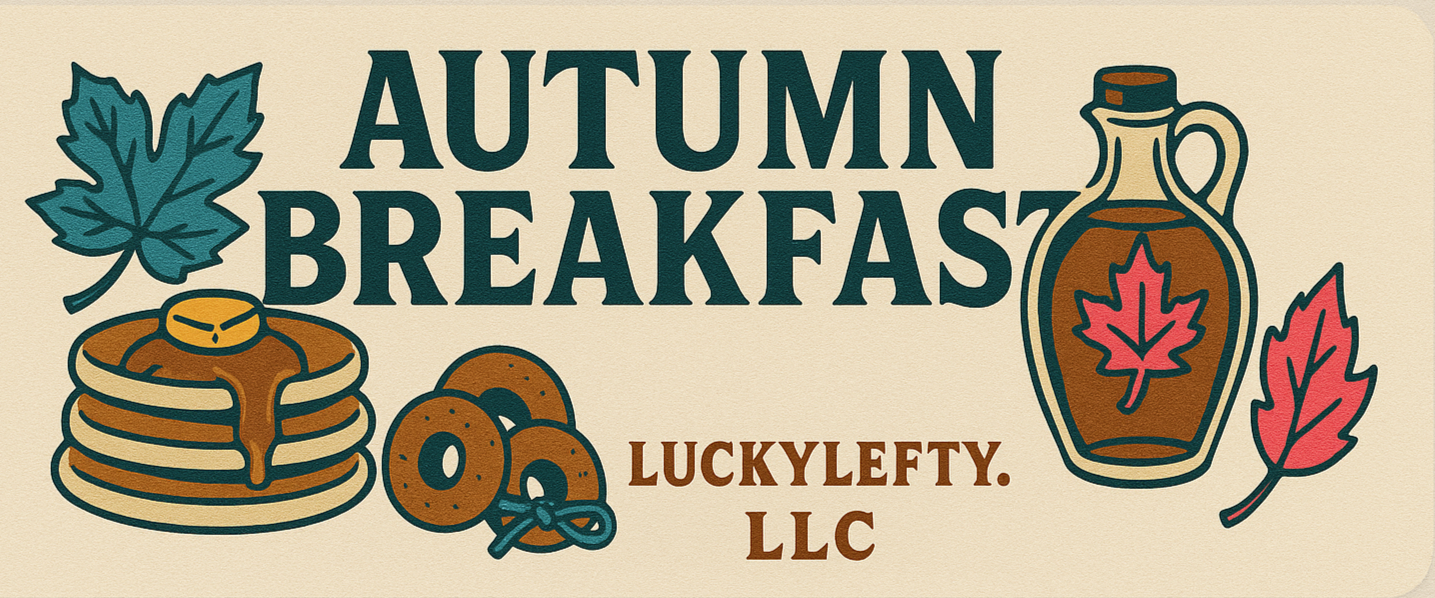 A cream canvas scattered with maple leaves, blackbirds, golden koi, and stacks of syrup. “THE AUTUMN BREAKFAST” is a print where cool mornings meet warm plates — fish dart under rippling ponds, bottles of amber syrup catch the light, and every leaf reminds you that the season is fleeting.