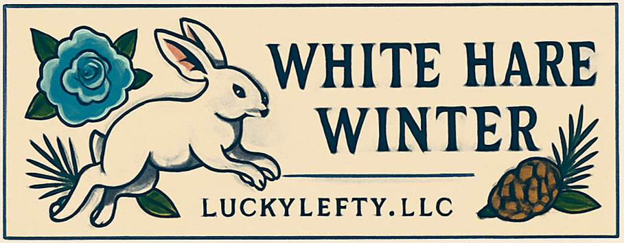 A pale blue woodland scattered with pine cones, waffles, and the quiet watch of a snow hare. “THE WHITE HARE WINTER” is a print where crisp air meets warm syrup, where fur blends into frost, and the forest offers both comfort and caution.