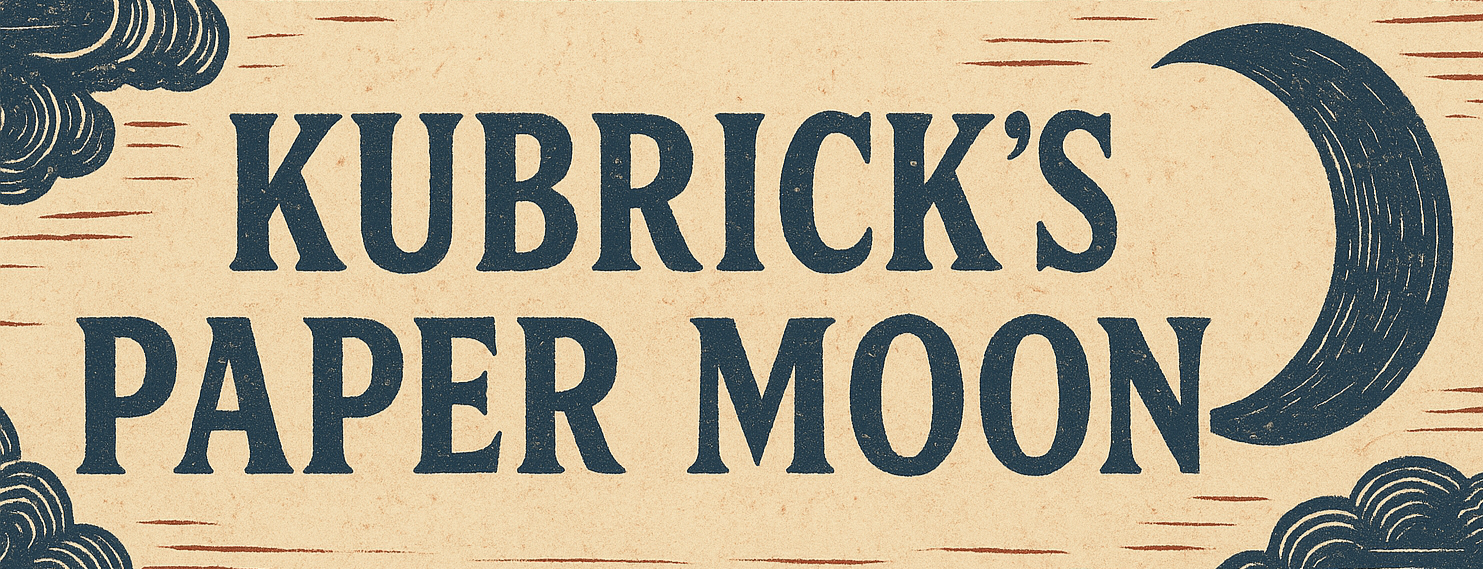 Astronauts plant flags, cameras roll, and clouds drift across a dark sky stitched with suns. “KUBRICK'S PAPER MOON” is a print that plays with history — equal parts cosmic homage and conspiracy wink. Navy base, burnt orange clouds, and staged-or-not astronauts walking across fabric like a storyboard.